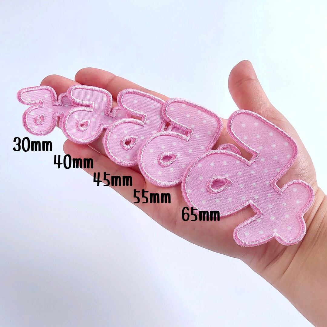 てむっとオリジナルのドット柄の生地を使ったひらがな一文字ワッペンです。